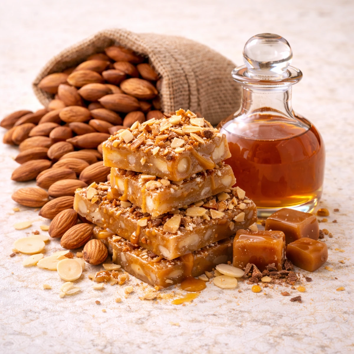Golden buttery toffee crackling with roasted almond crunch, delivering sweet caramelized richness with irresistible candy-shop indulgence.
