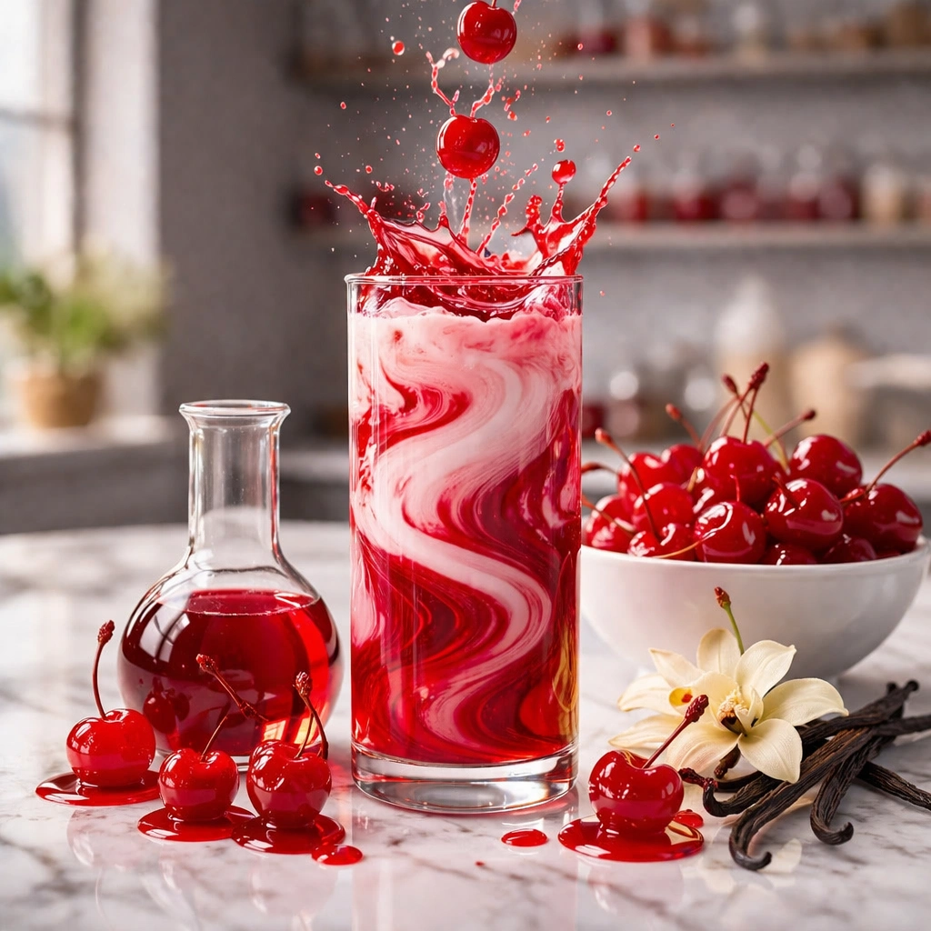 Bright sweet maraschino cherry flavor with juicy candy-like fruit notes, a creamy vanilla bite, and nostalgic soda fountain character.