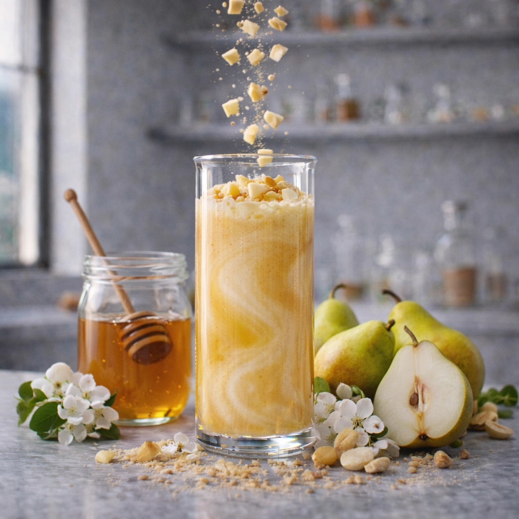 Delicately sweet pear flavor with floral honey notes, soft buttery richness, and gentle citrus brightness, delivering the refreshing taste of perfectly ripe orchard pears.