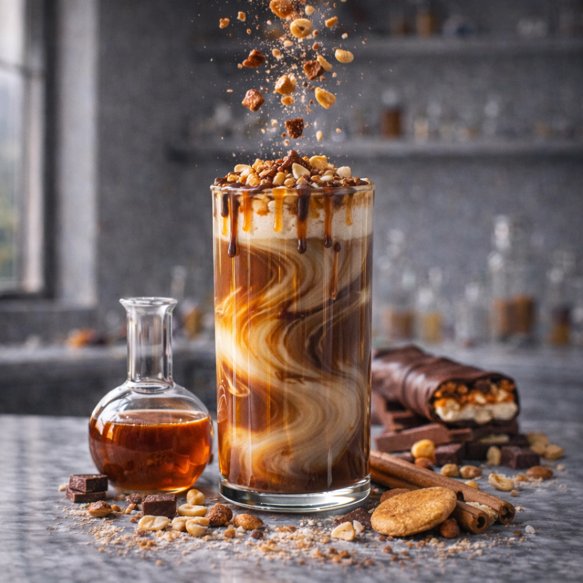 Milk chocolate and gooey caramel swirl into roasted peanuts and our signature deep peanut butter, finishing with soft nougat sweetness. A decadent candy-bar inspired indulgence perfect for dessert coffees and blends.